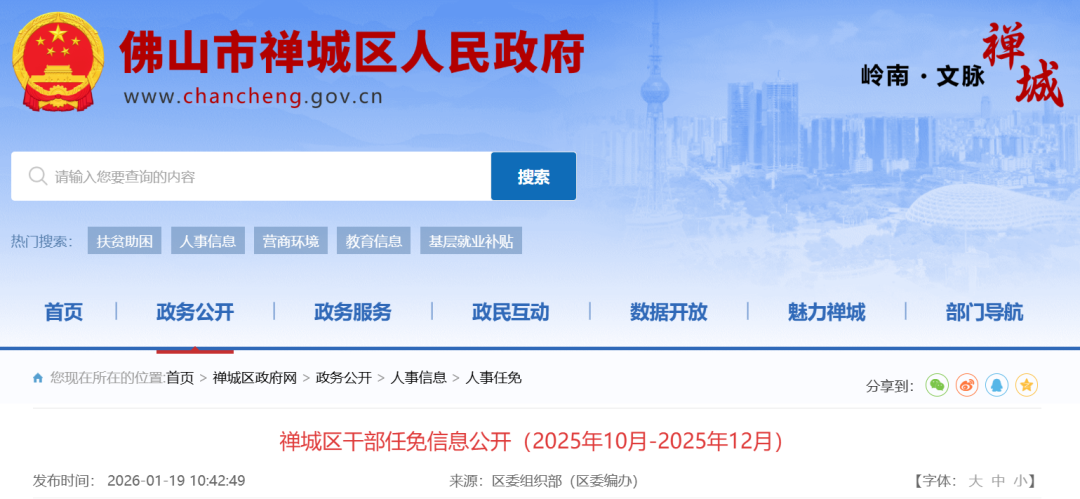 近日,佛山禅城区政府官网公布干部任免信息。