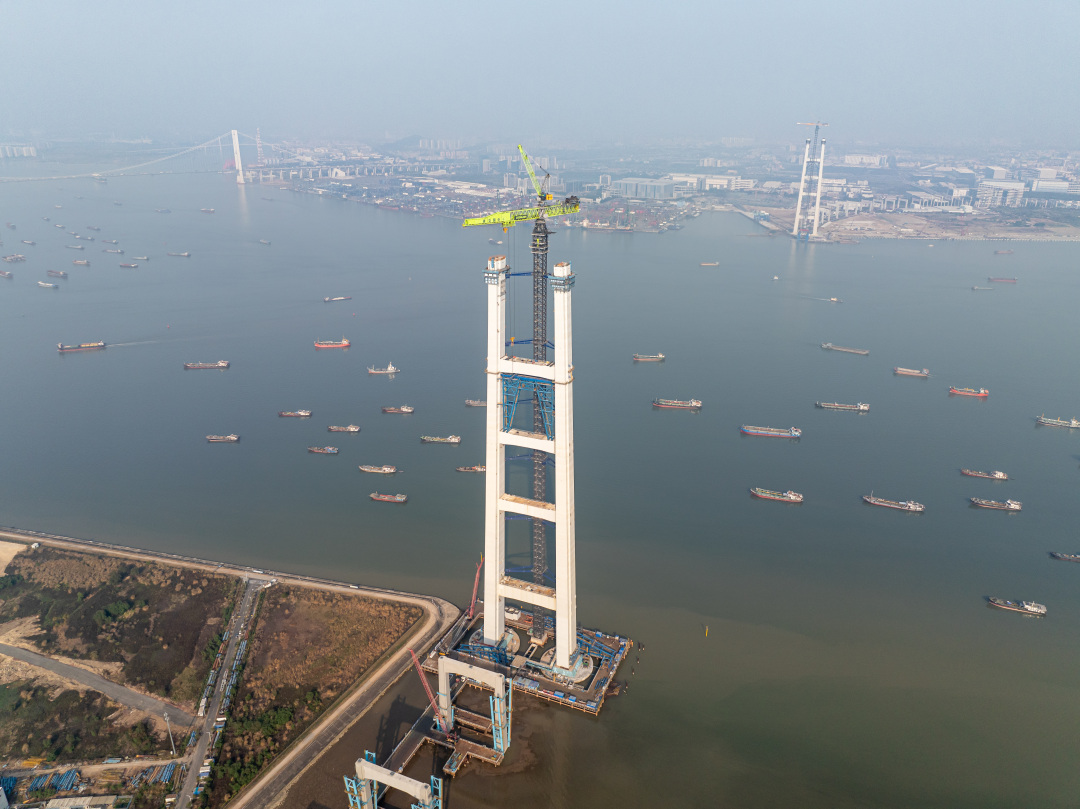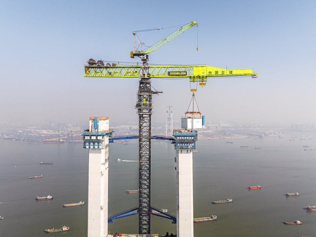 狮子洋通道主塔342米高,相当于110层楼高,设6道横梁,单幅塔肢由62个巨型钢壳节段精准拼装。
