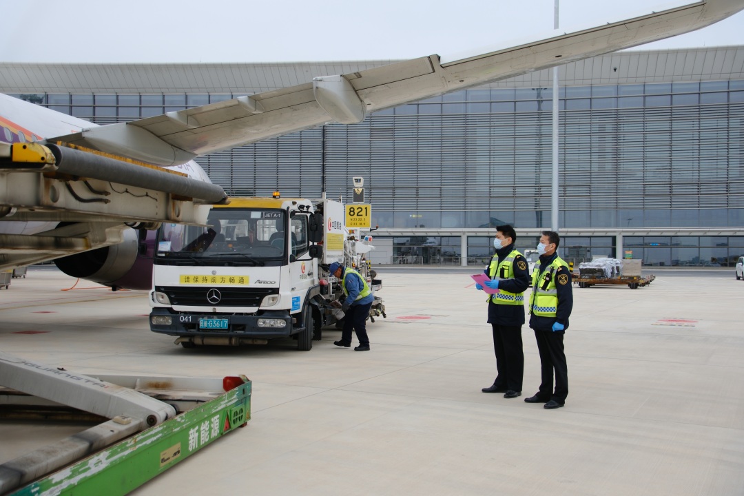 广州海关所属广州白云机场海关关员对广州白云国际机场T3航站楼国际业务启用后首个进境航班进行机边监管。