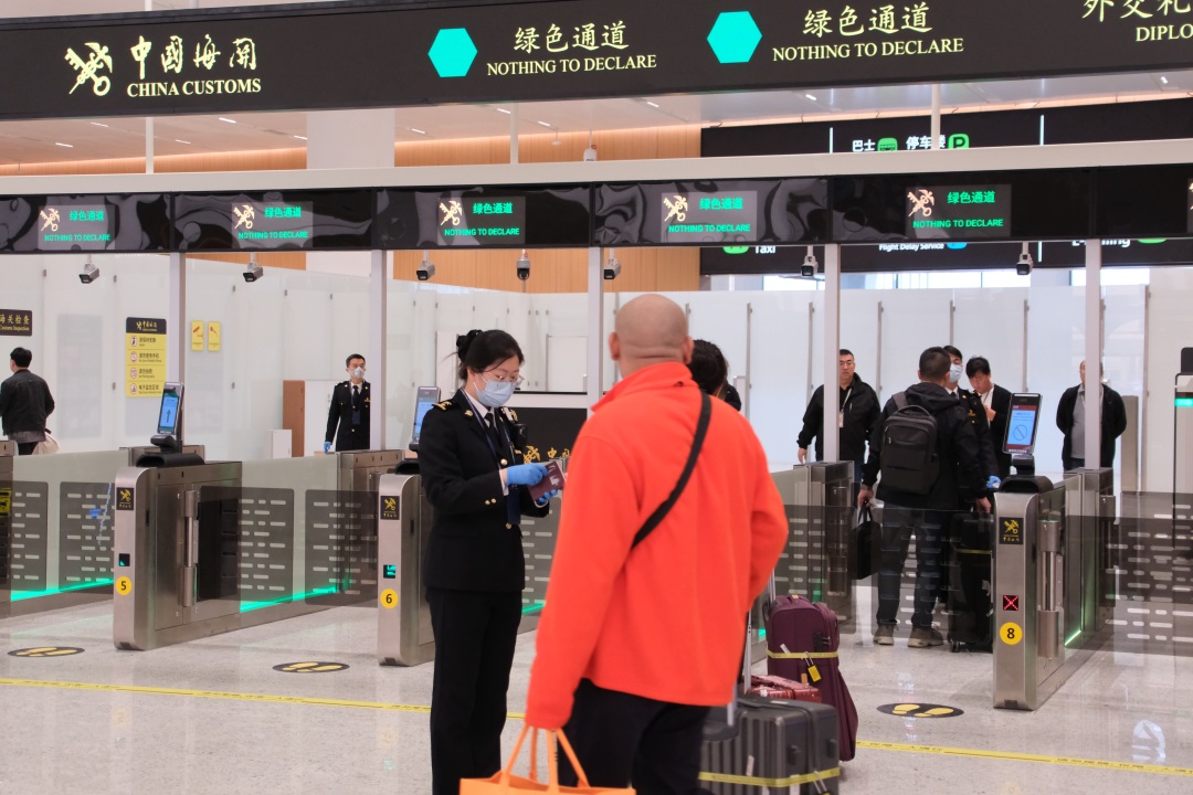 广州海关所属广州白云机场海关保障广州白云国际机场T3航站楼国际业务启用后首批进境旅客高效通关。