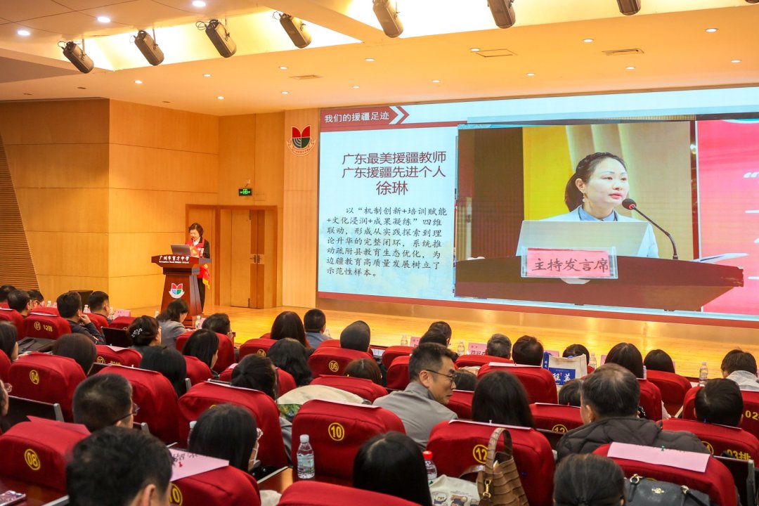 报告会重点分享了五位援疆教师的先进事迹。他们凭借创新教学模式、长效帮扶机制与深度文化传承实践,生动诠释了新时代师德的丰富内涵。其中,广州市育才中学教师沈明以“接力者、赋能者、践行者”为定位深耕援疆教育一线。她创新“四互雁阵”教学模式,将科学教法与文化元素深度融合,所教班级成绩稳居全县前列,带领学生实现省级英语赛事零的突破;同时,她牵头成立名师工作坊,开展讲座 50 余场,指导60余名当地教师斩获40多项省级以上奖项,募集公益款物50余万元。其教学成果多次被中央媒体报道,40余万字的实践总结与精准帮扶案例,成为粤疆教育协作的生动注脚。
