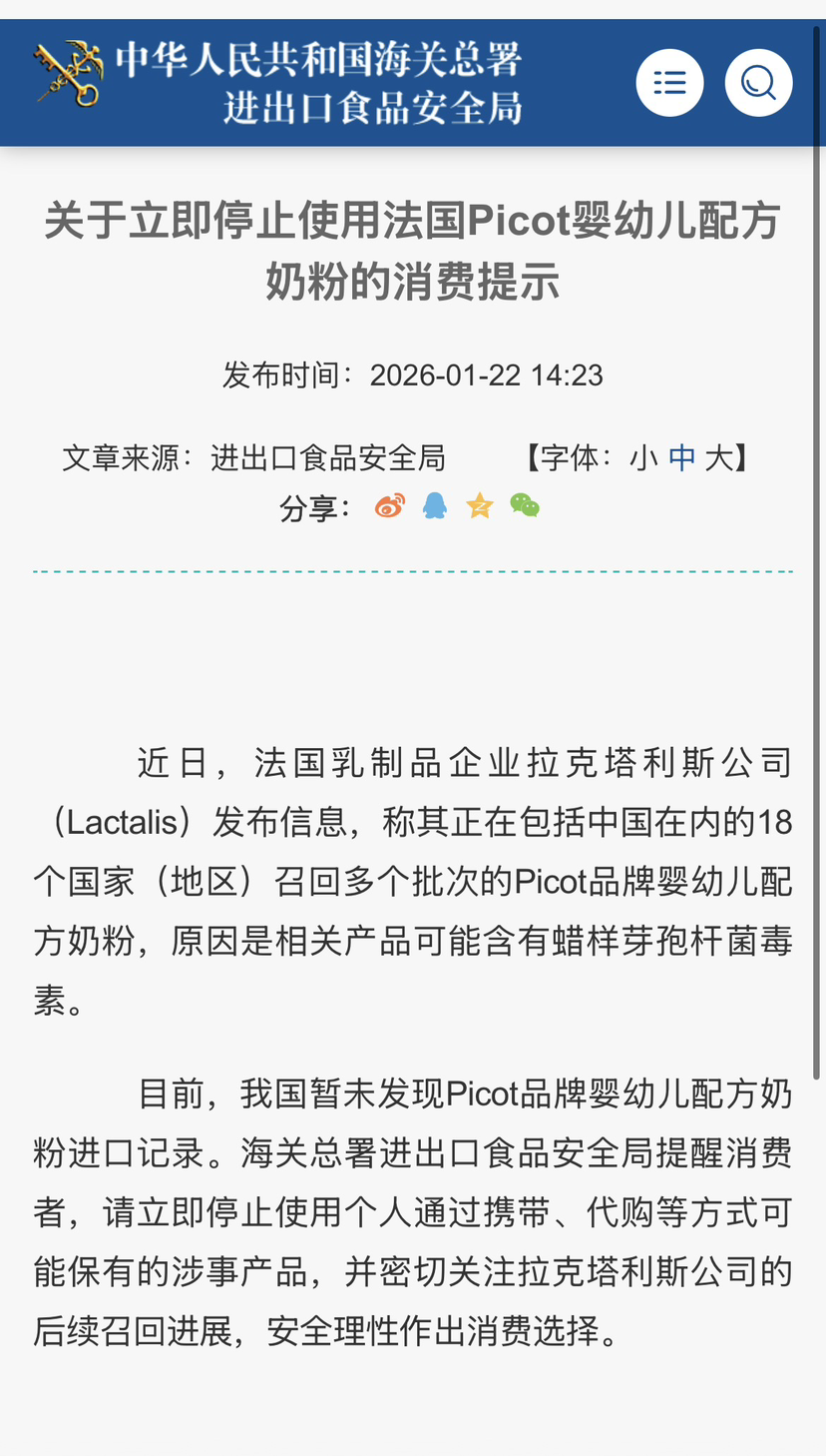 海关总署此前已于1月7日就雀巢部分奶粉召回事件发布过消费提示,持续对进口婴幼儿配方奶粉等敏感商品保持高度监管与关注。