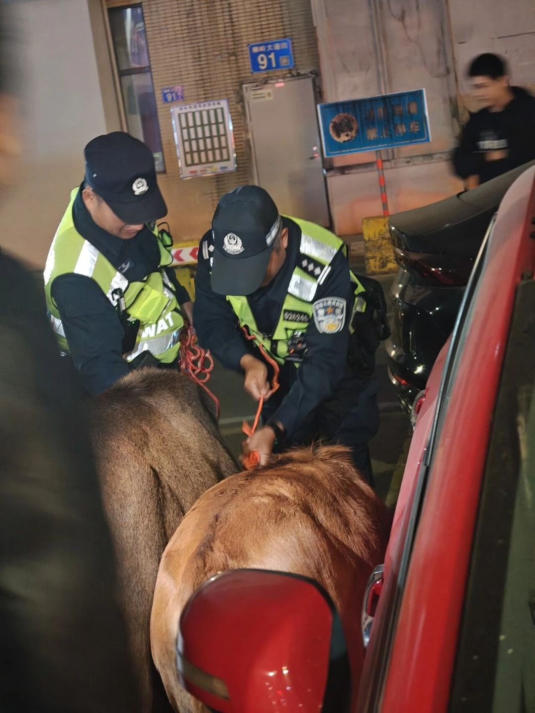 为确保安全可控,民警从巡逻车上取出车载救生绳,为两头黄牛系上。随后,民警牵引着黄牛、市民在旁协助看护,众人合力将黄牛护送至附近空旷安全的区域,成功化解了这场深夜道路危机,让主干道交通迅速恢复畅通。