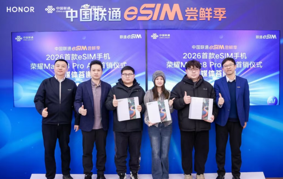 1月23日,中国联通eSIM尝鲜季2026首款eSIM手机——荣耀Magic8 Pro Air首销仪式暨媒体答谢会在北京西单联通营业厅举行。中国联通集团市场部副总经理尹少春、联通华盛总经理李立新、荣耀中国区副总裁徐涛、北京联通副总经理秦洋、联通华盛副总经理陈丰伟、京东3C数码事业群手机事业二部总经理卢志锋、京东3C数码事业群运营商部总经理庞誉等嘉宾共同出席,见证2026年国内首款eSIM手机正式上市,标志着中国联通与荣耀、京东三方战略合作迈入全新阶段。