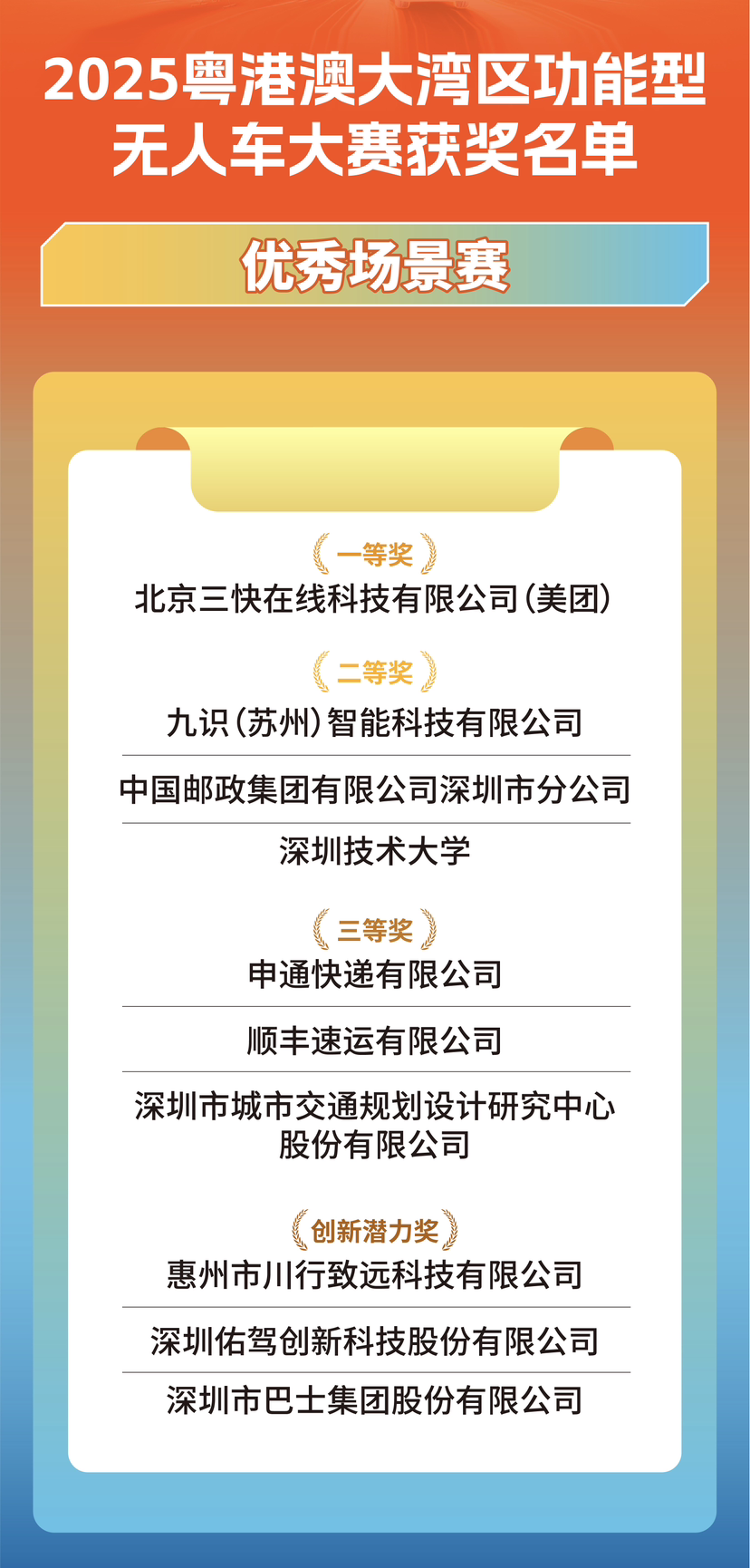 作为全国首个聚焦功能型无人车技术与安全能力的专业赛事,大赛在深圳市交通运输局、深圳市新能源汽车产业办公室、深圳市城市管理和综合执法局、深圳市坪山区人民政府、中共深圳市新能源和智能网联汽车产业链委员会的共同指导下,于深圳坪山湾区智联试验场圆满落幕。赛事以“智驭湾区·安创未来”为主题,通过“专项测试”与“优秀场景”双赛道,完成了一场高规格的行业检阅。