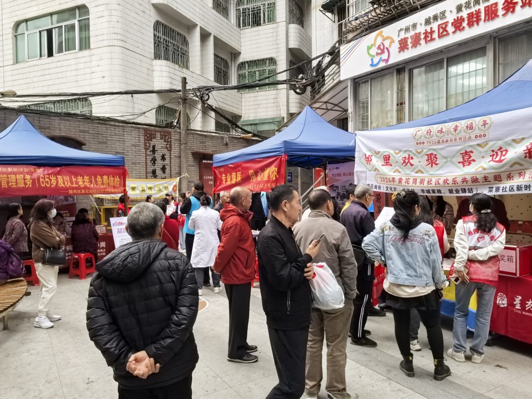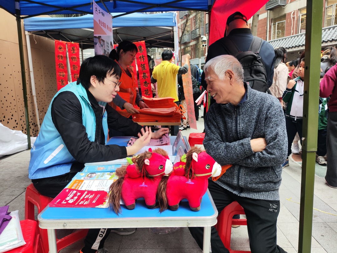 活动现场设置民生政策宣传、健康科普、趣味互动、民俗文化体验4个特色区域。民生政策宣传区:社工为社区居民准备了养老政策咨询、城乡居民养老保险领取、机构养老、社保卡领取办理申请;羊城家政为居民提供居家保洁、居家照护、母婴照护等多项服务推介,成为专业可靠的“贴心管家”;就业驿站为劳动者提供就业咨询、岗位推介、技能培训等服务,让求职者“好就业、就好业”,让用人单位“好找人、找好人”。健康科普区:社区卫生服务中心关注老年人健康,现场为居民测量血压、开展健康咨询与答疑、开展老年人健康管理知识科普,为居民提供专业口腔护理服务,宣传护牙知识。趣味互动区:互动答题、抛圈小游戏,现场互动氛围热烈,参与者排起长队纷纷下场抛圈领小礼品。民俗文化体验区:“喜迎新春”几个大字一气呵成,红底墨字的春联铺满长桌,书墨香气飘满广场。