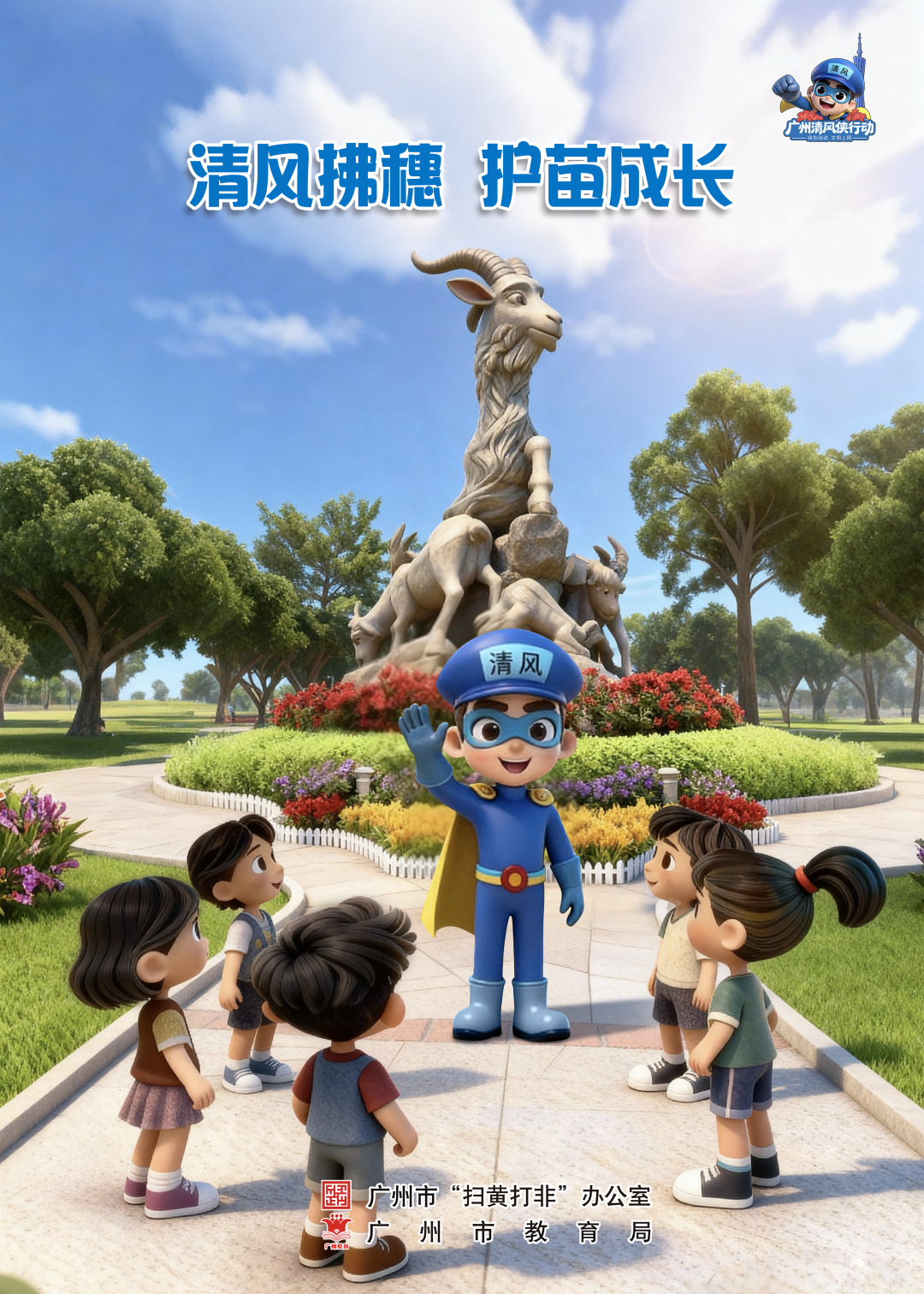 地标打卡场景:五羊石像前,“清风侠”带队研学,传递“清风拂穗,护苗成长”的理念,强化社会协同护苗氛围;
