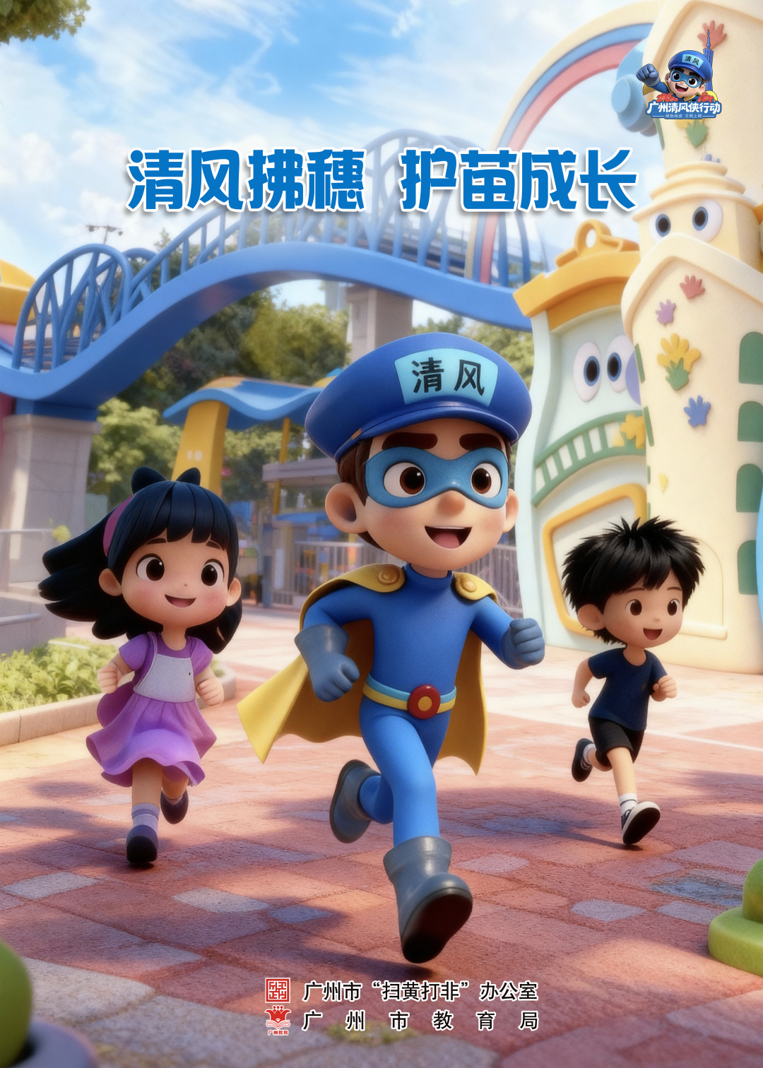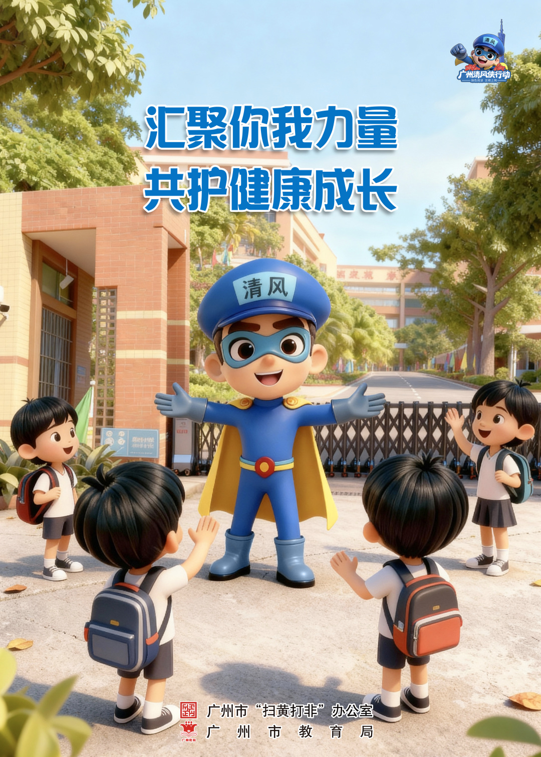 校园守护场景:“清风侠”立于校门旁,倡导“汇聚你我力量,共护健康成长”,号召家校携手筑牢校园防线;