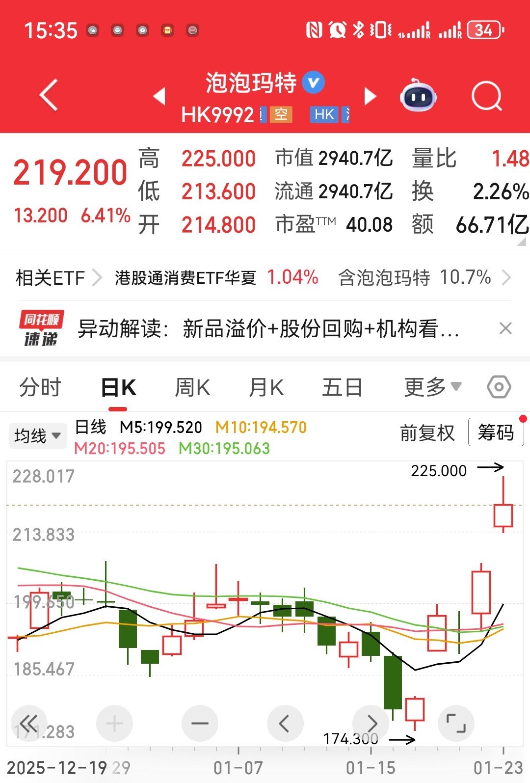 截至发稿,泡泡玛特股价报219.2港元,单日涨幅超6%,本周以来涨幅22.73%。