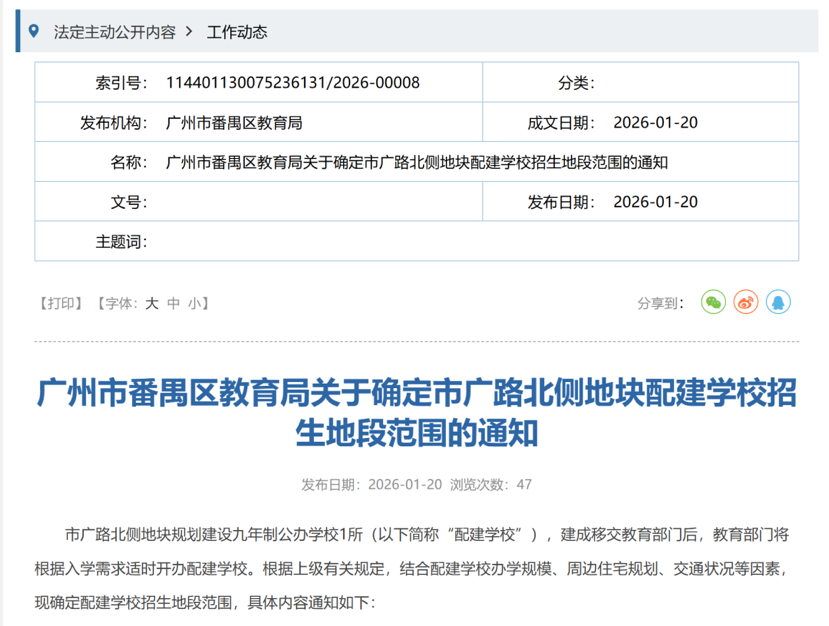 1月20日,广州市番禺区教育局发布了《关于确定市广路北侧地块配建学校招生地段范围的通知》,明确了钟村一所新的九年制学校的招生地段范围。
