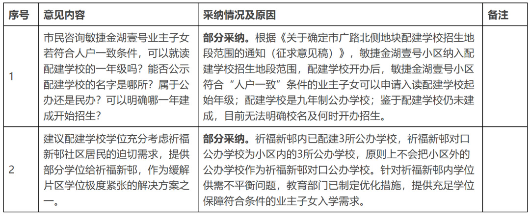 《关于确定市广路北侧地块配建学校招生地段范围的通知(征求意见稿)》意见反馈及采纳情况表