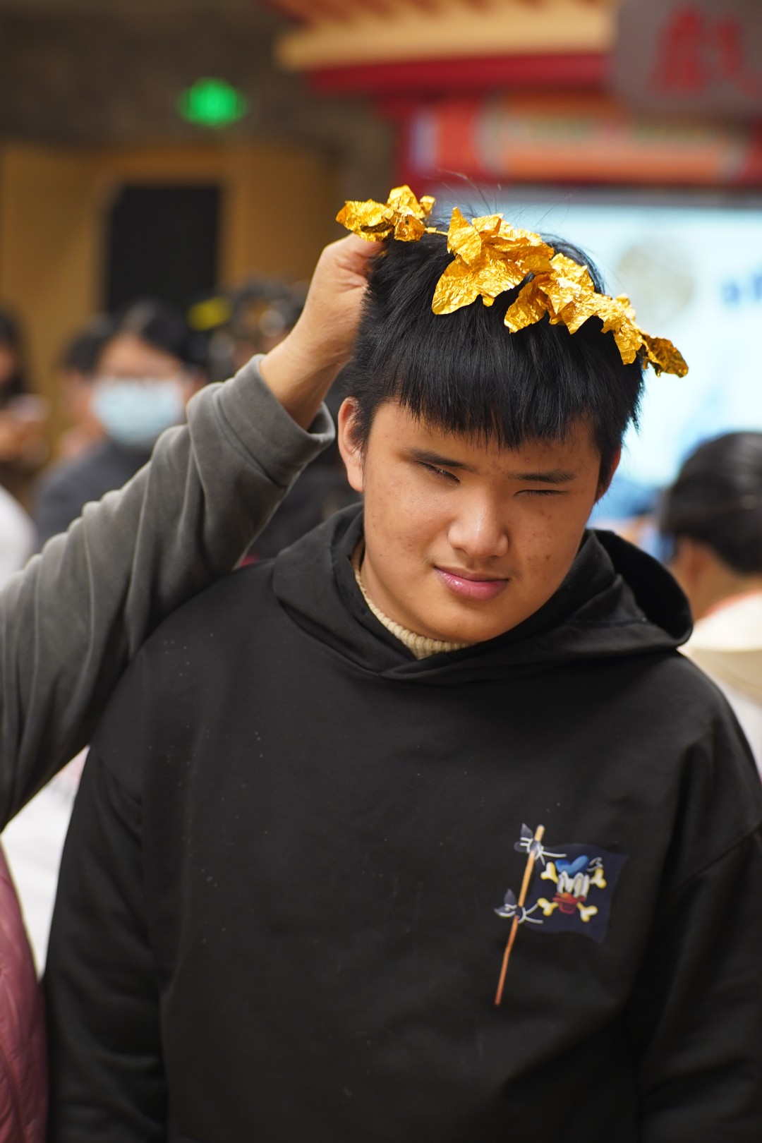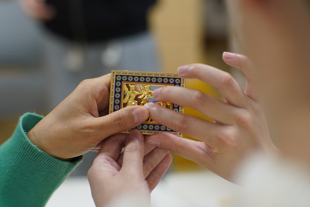 这趟千年史诗之旅从视障朋友们的触摸环节开启。狩猎场景圆盘上激烈的搏斗纹路、男性立像庄严的身姿、兔首来通杯光滑的曲线、宫廷场景装饰板细腻的錾刻……通过指尖的触感与志愿者精准的描述,文物从视觉艺术转化为可感知的立体存在。触摸体验之后,视障观众认真地聆听。随着金牌志愿者陈晶老师娓娓道来的讲解,视障观众跟随着“铜石并臻”“帝国华章”“希腊荣光”与“波斯华彩”这四个史诗篇章,一同走进了科威特所历经的两河流域、古希腊与波斯文明的灿烂星河,切身感受其跨越千年的文明多样性。