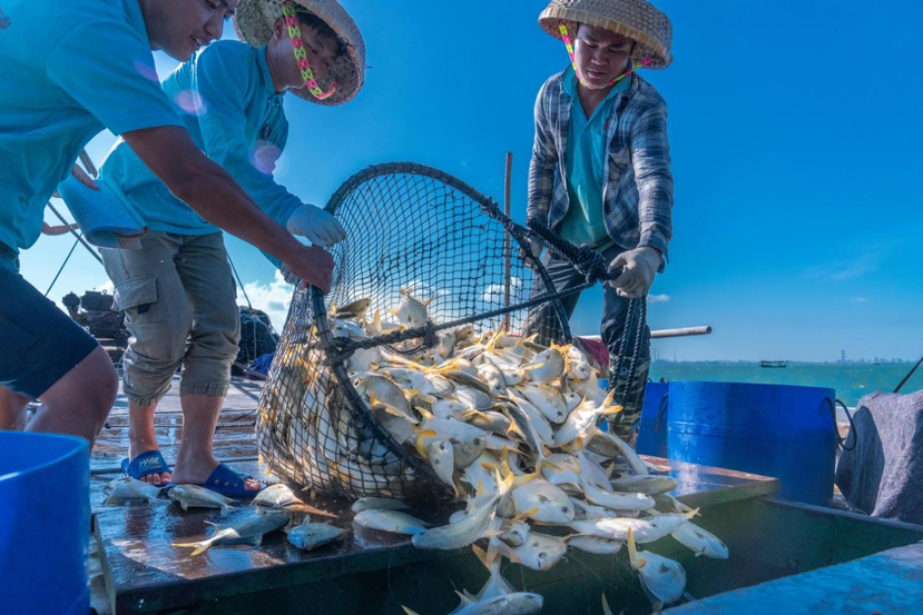 南海之滨,广东渔民在碧海蓝天下收获满满一网金鲳鱼
