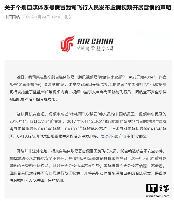 1月24日,中国国航发布关于个别自媒体账号假冒我司飞行人员发布虚假视频开展营销的声明: