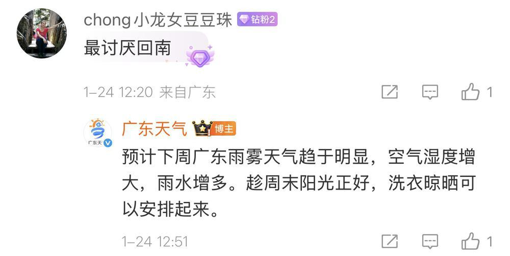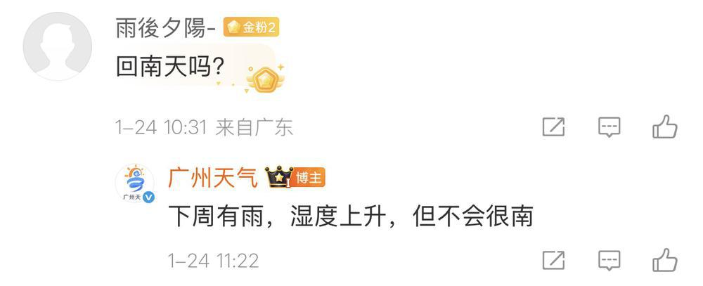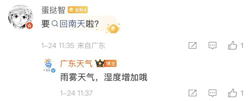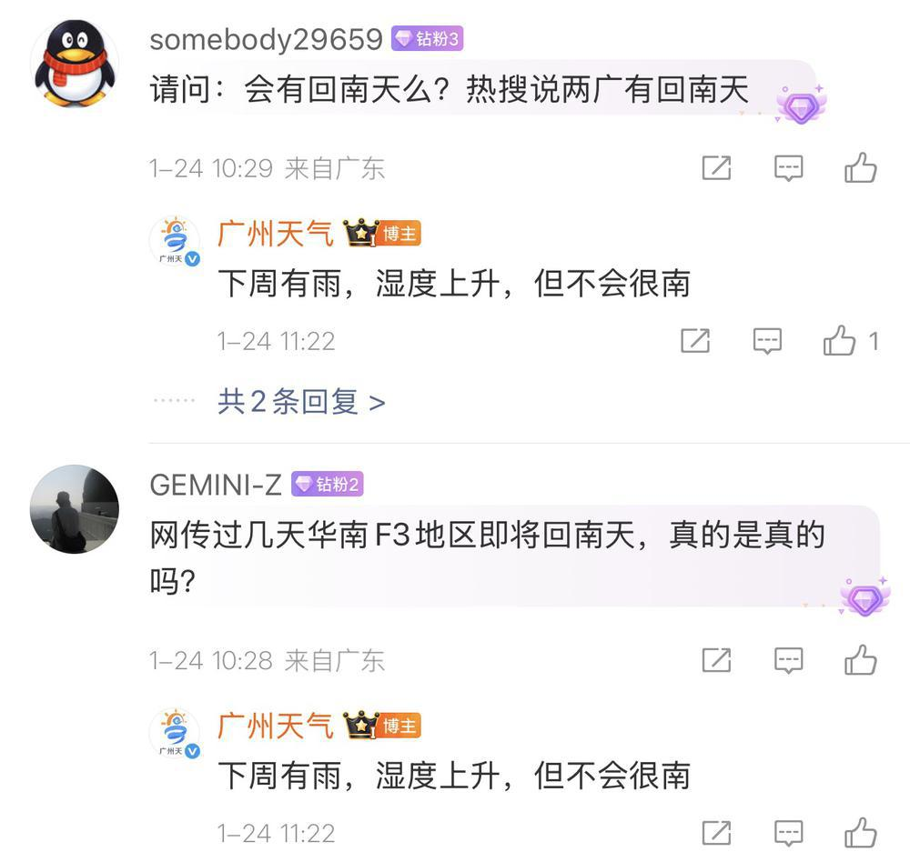 由于“升温”“雨雾”等字眼出现,不少网友担忧广东将出现恼人的“回南天”现象。对此,广东省气象部门和广州市气象部门,1月24日通过新浪微博“@广东天气”和“@广州天气”,一一向表达疑问或担忧的网友回复。