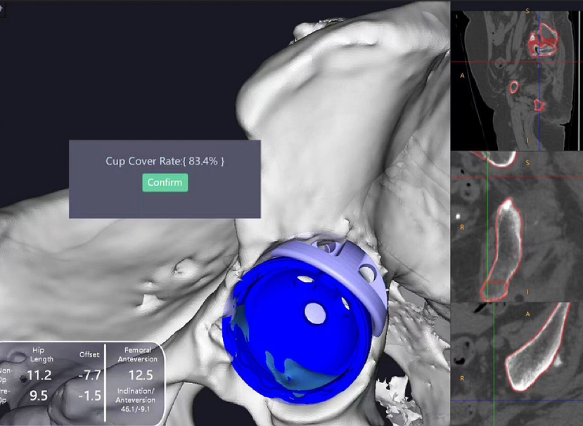 据悉,该患者为一名长期受重度髋关节疼痛困扰的老年人,其髋臼同时存在上缘与外缘严重骨缺损,传统术式难以兼顾假体稳定性与解剖复位。面对这一国际性临床难题,那达素医院骨科团队借助来自深圳的锟铻®机器人强大的亚毫米级三维重建、智能规划与实时导航能力,首创将两个Augment模块拼合使用,构建出定制化的“Footing假体”——如同为髋臼假体打造一个精准贴合的“生物型基座”。不仅显著提升骨覆盖率,更将关节旋转中心恢复至生理位置,从根本上保障假体长期存活率。