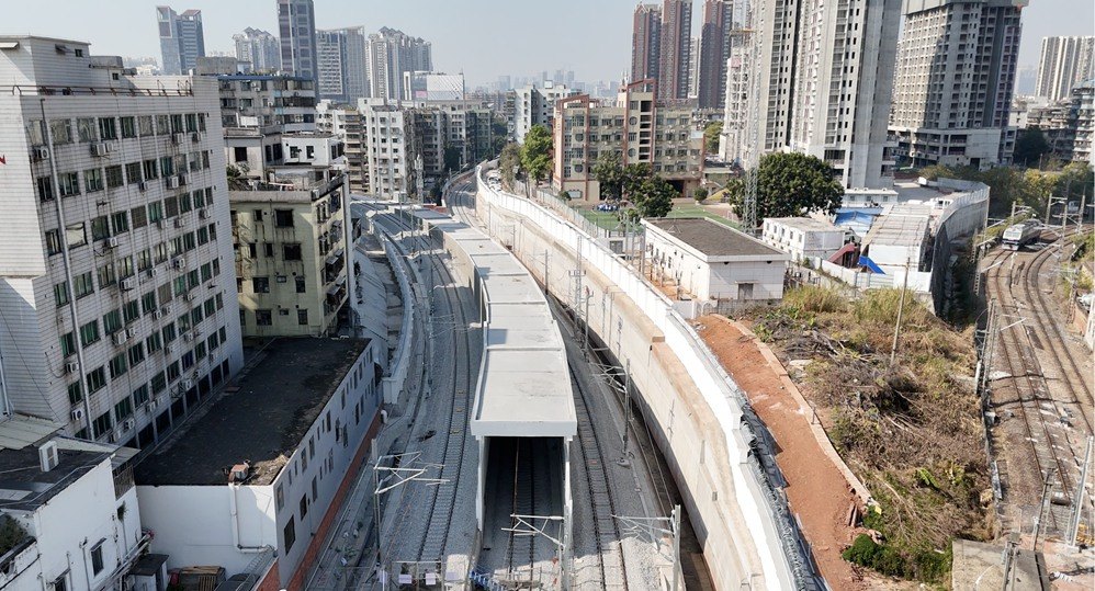 越是关键工程,越需直面攻坚硬仗。该工程地处广州市越秀区核心区域,施工区域被密集的城市建筑群、繁忙的市政交通网络和错综复杂的既有铁路干线层层环绕,施工空间极度受限,安全风险高,协调难度大,堪称在城市“心脏地带”开展高精度“外科手术”。面对前所未有的挑战,广州工程建设指挥部锚定“安全、优质、高效”建设目标,将技术创新与精细管理深度融合,主动对接属地政府,建立常态化沟通协调机制,仅用4个月便高效完成征拆工作,为工程顺利推进扫清障碍。