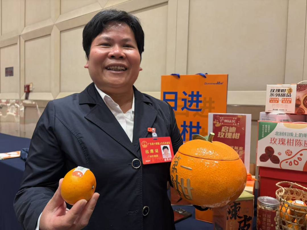 “这是来自广州从化的玫瑰柑,从最初的一个柑到现在和猪肉一起做成玫瑰柑腊肠,大家吃了都说好。”省人大代表、广州友生农业科技有限公司董事长潘翠玲表示,现在玫瑰柑的种植面积已有4000多亩,希望以玫瑰柑为龙头产品,带动乡村振兴。“除了吃的,这里还有‘第一桶柑’茶。粤语里面‘柑’音同‘金’,希望返乡青年都能越来越有奔头,能收获自己的‘第一桶金’。”