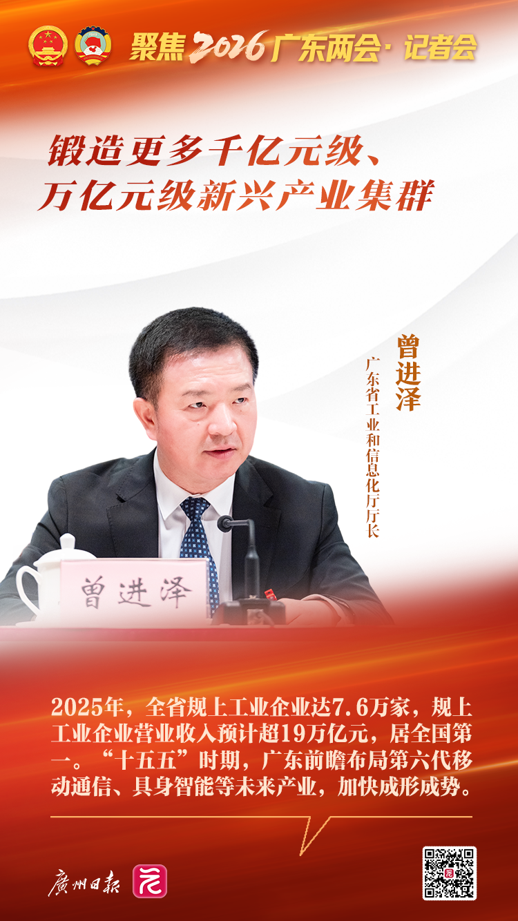 1月26日下午,广东省十四届人大五次会议召开省直部门专场记者会,广东省工业和信息化厅厅长曾进泽介绍了2025年广东在工业和信息化领域取得的显著成绩。其中,全省规上工业企业达7.6万家,规上工业企业营业收入预计超19万亿元,居全国第一;数字产业收入超8万亿元,居全国第一;人工智能、机器人、生物医药、集成电路、超高清视频等产业稳居全国第一方阵。曾进泽表示,面向“十五五”时期,广东将锻造更多千亿元级、万亿元级新兴产业集群。