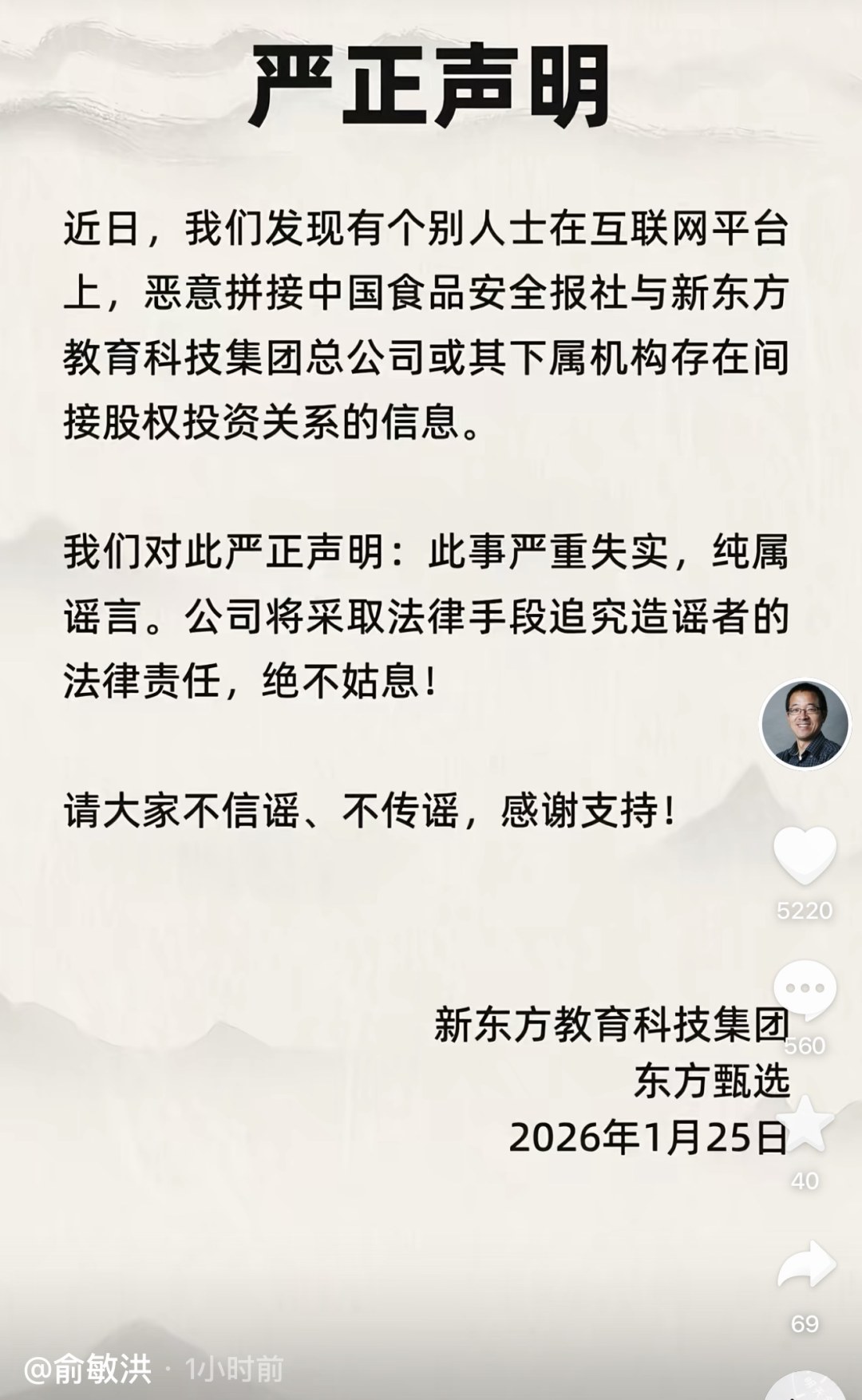 1月26日,新东方创始人俞敏洪个人社交账号发布严正声明:近日,发现有个别人士在互联网平台上,恶意拼接中国食品安全报社与新东方教育科技集团总公司或其下属机构存在间接股权投资关系的信息。