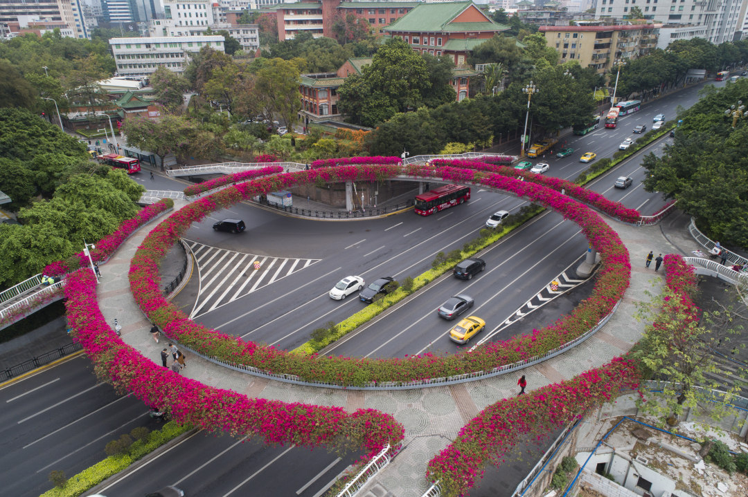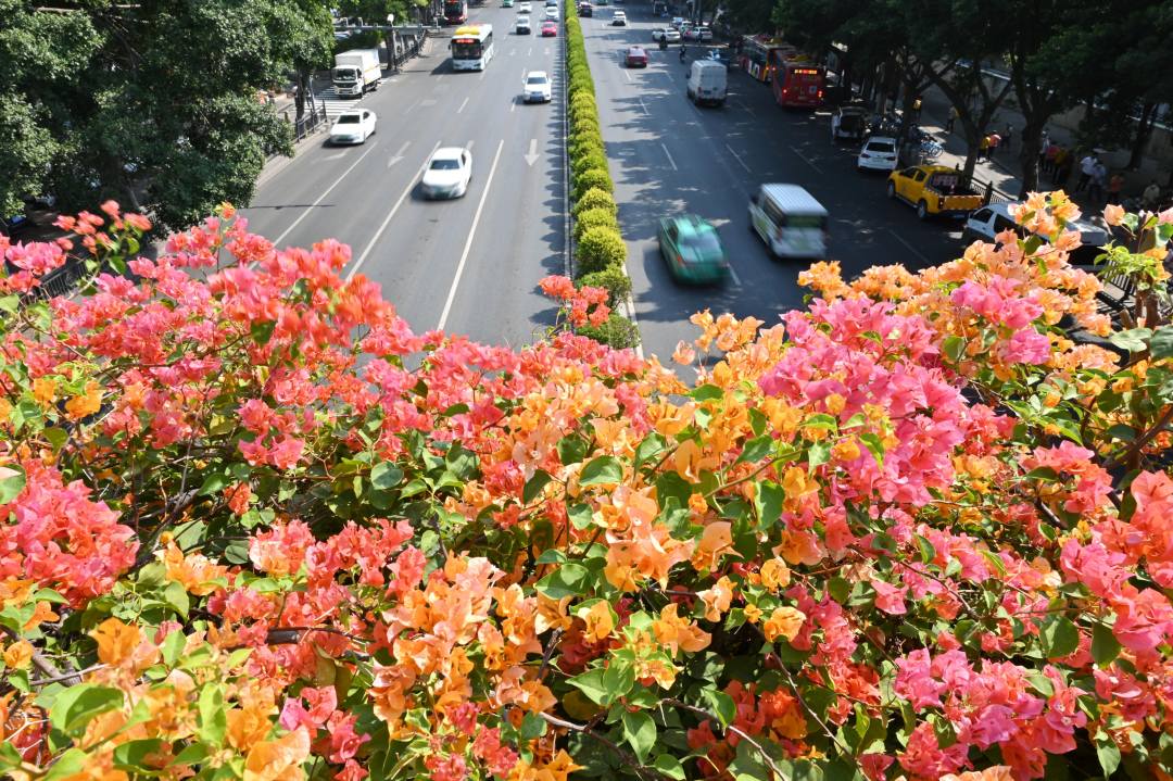 东风路的粉白、环市路的火红、新港路的橙黄……姹紫嫣红的簕杜鹃花团沿着天桥蔓延如彩带轻扬,让花城天际线多了几分热烈奔放的烟火气。