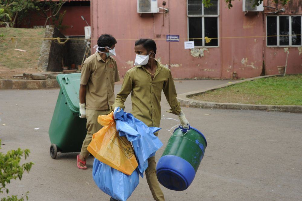 2023年9月,印度喀拉拉邦,穿着防护装备的卫生工作者处理尼帕病毒隔离中心的垃圾。图/央视新闻