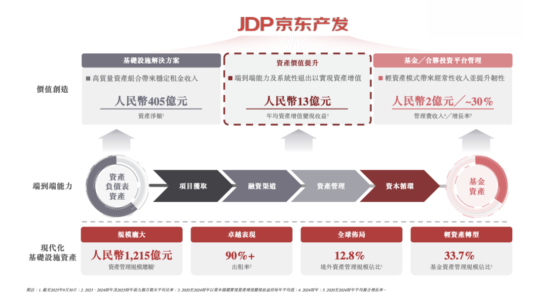 京东产发的三大主要业务分别为:基础设施解决方案、资产价值提升以及基金╱合伙投资平台管理。据披露,截至2025年9月30日九个月,来自基础设施解决方案的收入总额为人民币26亿元,其中16.7%来自境外资产。