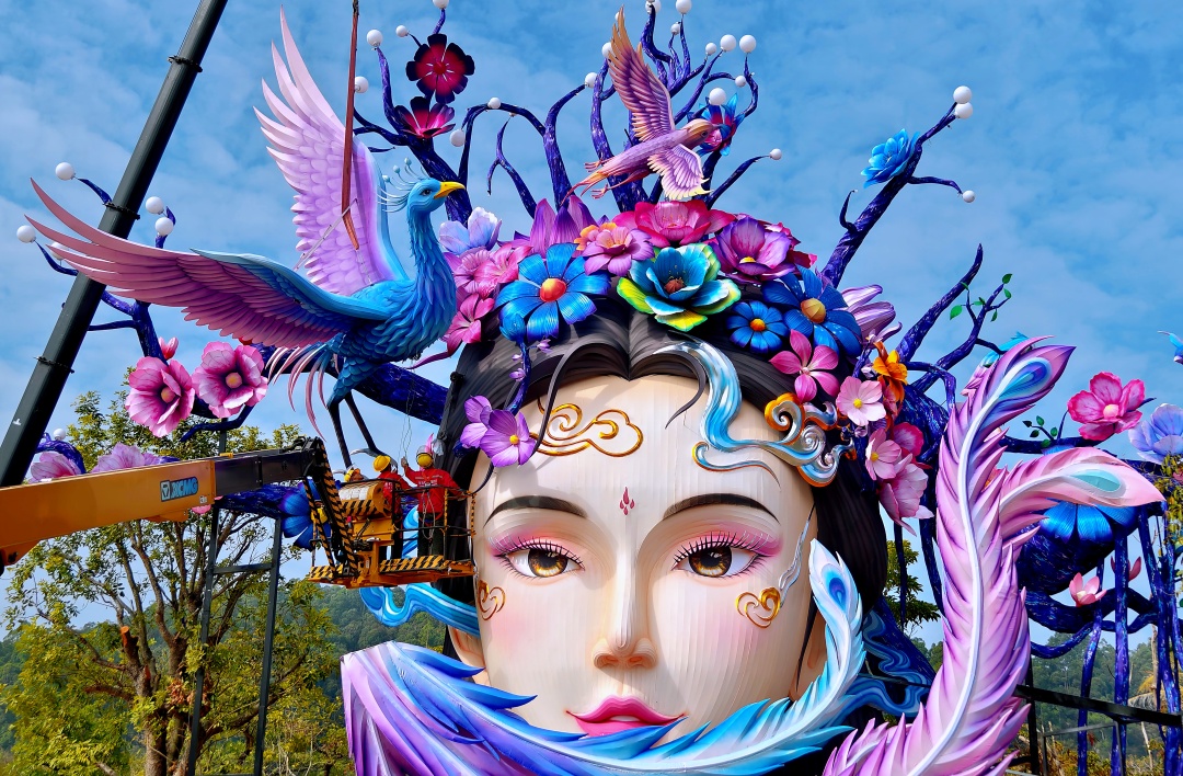 1月27日,2026年大湾区灯会“绿野仙踪·生态和鸣”展区,正在搭建中的“南沙女神”灯组。