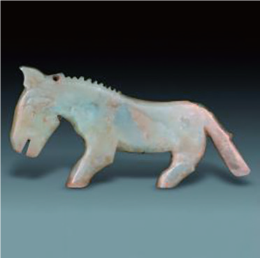 1976年从河南安阳妇好墓中出土两件玉马,玉料相同,推测出自同一块玉料。两块玉马是中国墓葬中出土最早的玉马形象。该玉马为灰色(图1),呈现行走状,马首低垂,双耳竖立,眼睛为目字形。玉器的背部雕刻有短细的鬃毛,腿部粗壮,玉器身体光滑。在玉马的耳部后面,设置有小圆孔,可用于玉器的穿系。1993年,山西晋侯墓地63号墓出土了周代玉马,该玉马立体圆雕,呈现站立状,身体比例协调,表现马的站立姿态。1966年,陕西咸阳出土了仙人玉奔马,此马玉质洁白,马为奔驰的形态,看起来气势非凡,在马背上有仙人端坐。魏晋时期的玉马形象稀少,唐宋时期虽有玉马,但是出土比较少。明代时期玉马雕刻简练,静态玉马比较多见。清朝时期玉马更注重细节雕刻,呈现出形似的玉马。马身形矫健,古人使用马的形象表达奔腾向上的精神。