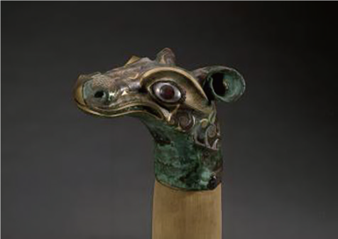 错金银马首形青铜䡇(图3)为马首造型的青铜车辕饰件,铸造精良。其头、颈部运用错金银工艺,以金、银丝镶嵌出繁复的卷毛纹与鳞纹,纹饰精美流畅,是战国时期错金银青铜器的典范之作。该器出土于辉县固围村大墓。此墓为带两条墓道的“中”字形高等级墓葬,并建有陵园,其规制与诸侯陵墓相仿,被认为是目前已发现的魏国墓葬中等级最高者。墓中出土器物多工艺考究,从此件辕饰即可窥见当时贵族阶层奢华的生活与葬制。