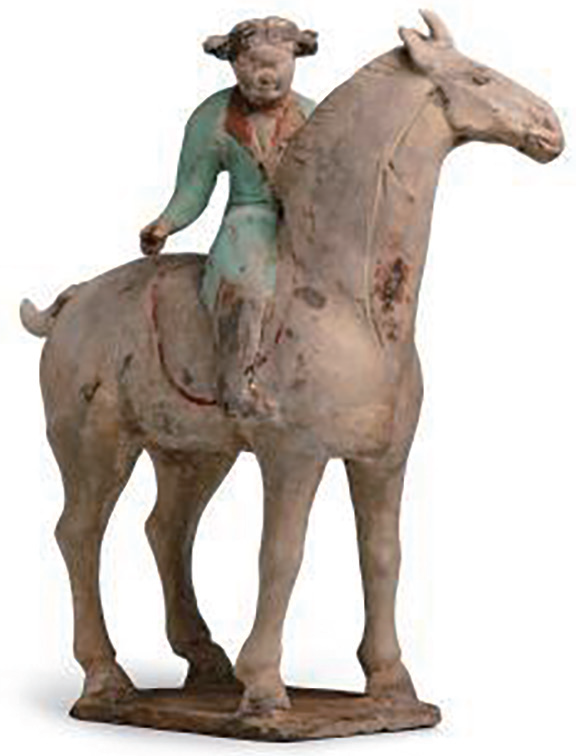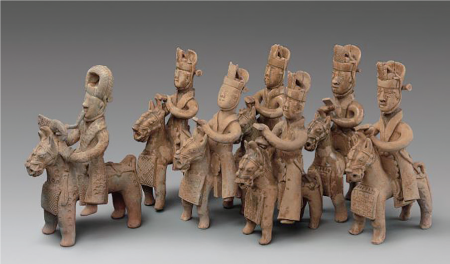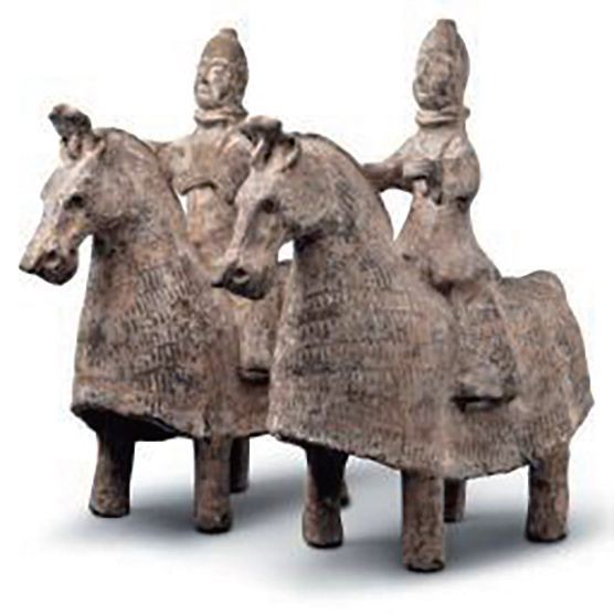 陶俑(图7)出土于西晋一位县令墓葬中,共包括29件,其中23件为仪仗俑,种类涵盖文吏、武吏及7件骑俑。在骑俑中,6件手持方版,其身份应为县令下属的掾属官吏;另有1件作吹奏乐器状。仪仗队伍规模是判断官员等级的重要标志,此组陶俑生动再现了西晋低阶官员的出行规制。部分陶俑马身左侧塑有一个三角形马镫,虽仅具上马辅助功能,却是目前中国考古所见年代最早的马镫实物形象。马镫的出现经历了从单侧至双侧的演变过程,至公元4世纪逐渐成熟。这一发明极大提升了骑乘的稳定性,轻骑手体力消耗,推动骑射技术的发展,为后世重装骑兵的兴起奠定基础。