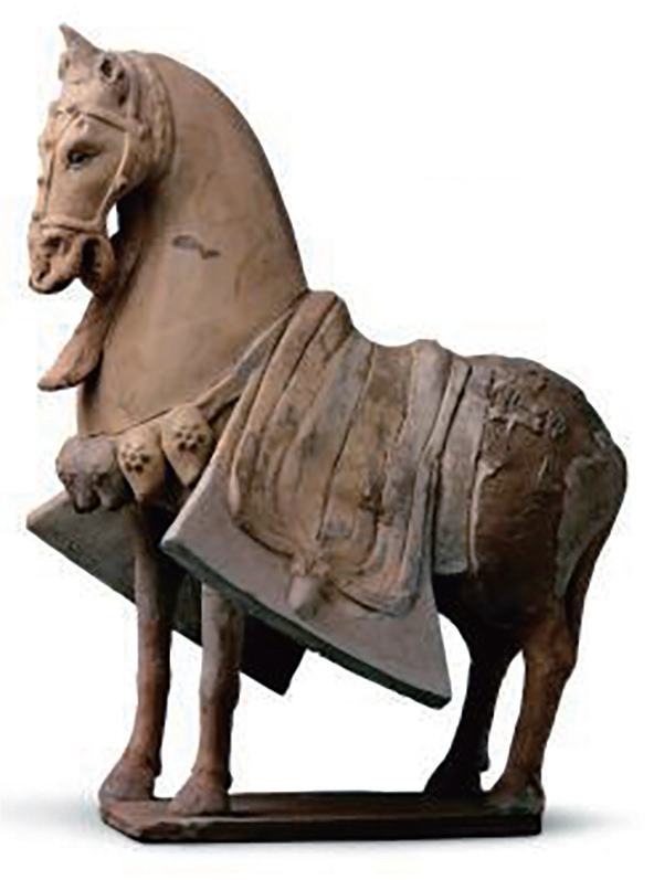 陶马(图9)形体矫健,姿态生动,作低头嘶鸣状,似处于整装待发之瞬间。马背配有鞍鞯,两侧障泥修长垂落,马具刻画工致细腻,反映出当时陶塑工艺对细节的重视。北朝雕塑艺术自北魏后期起取得显著进展,无论在人物或动物形象塑造上,均体现出更加准确的形体比例与动态表现力。此陶马表现出当时的艺术特点,观感非常俊美。马匹作为北朝军队中重要的军事资源,备受政权重视。北魏通过征伐草原部族及设立官营牧场,大量获取与繁育马匹,如河西、河阳等地均设有大规模牧场。当时还推行以马匹为内容的赋税政策,扩充军马储备。北朝骑兵力量具备物质基础,为陶马艺术提供现实原型。