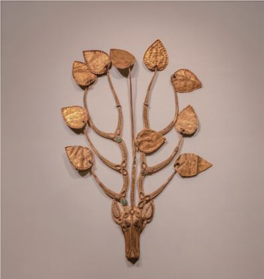 马头鹿角形金步摇(图10)基座为马头形态,头顶延伸出鹿角形枝杈,枝梢卷作环状,各垂挂一枚可随步摇动的金叶。马头与鹿角表面均嵌有珠饰,整体制作精巧,融合了动物意象与动态设计。步摇是中国古代女性特有的头饰,名源于佩戴者行走时饰件随之摇曳的动态特征。早在战国文献中已有记载,至魏晋南北朝时期广为流行。本品以草原常见的马与鹿为创作主题,反映出北方游牧民族的审美传统。作为兼具中原形制与草原装饰母题的代表性饰物,此金步摇是研究南北朝时期服饰艺术例证。