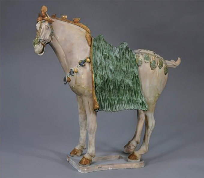三彩釉陶马(图11)通体施白釉,鞍具齐备,马鞍上覆墨绿色绒毯状障泥,胸前与股后络以绿色革带,带上饰黄色朵花并垂挂金铃,整体色彩对比鲜明,造型雄健,形态写实,生动再现了盛唐时期贵族乘骑的华贵风貌。唐三彩是中国陶瓷工艺发展的里程碑,成就主要体现在造型的生动性、釉色的丰富性、多色铅釉技术的成熟运用。此件白釉三彩马制作精良,装饰考究,反映唐代厚葬之风,代表了唐三彩烧造工艺的最高水平。