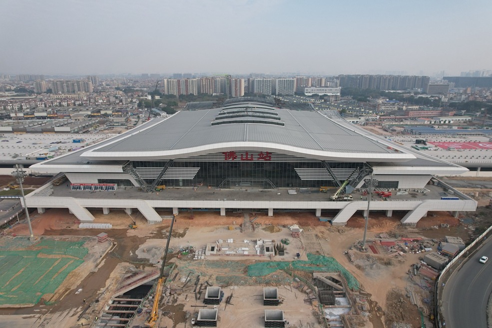 佛山站位于佛山市禅城区核心区域,是广湛高铁重要枢纽站之一。站房设计采用“南北侧集散厅+中部高架候车厅”布局,未来将引入3条地铁交通线路,实现高铁与地铁无缝衔接。车站总建筑规模约29.4万平方米,站场规模为4台9线(含预留1台2线),最高可聚集人数达2500人。预计年发送旅客初期约460万人次,远期约600万人次,建成后将成为佛山对接粤港澳大湾区、辐射粤西地区的重要交通门户。