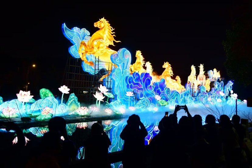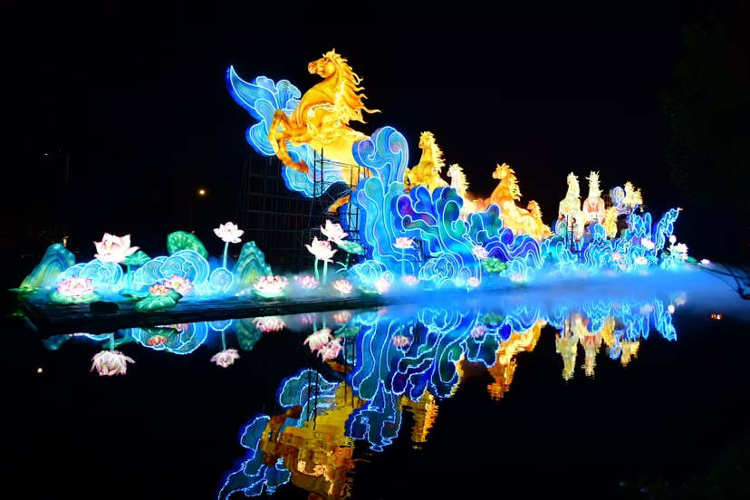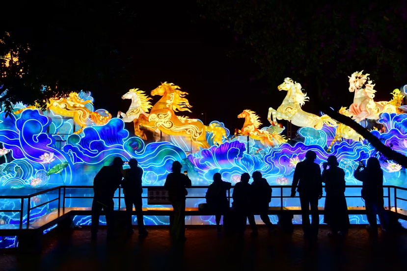 “万马奔腾”是本次灯会的重点大型灯组。这个灯组沿北秀湖主路段以长达百米的彩灯形式铺陈湖上,主体为九匹骏马,最高处达16.88米,呼应农历马年,它们姿态各异,或昂首向天,或踏浪疾驰,气势磅礴。据悉,其创作灵感融入近代“节马碑”所蕴含的忠勇不屈、坚守气节的精神内核,既生动喻示广州在新时代蹄疾步稳、奋勇向前的发展气象,也彰显其作为改革开放排头兵始终领潮争先的昂扬姿态。