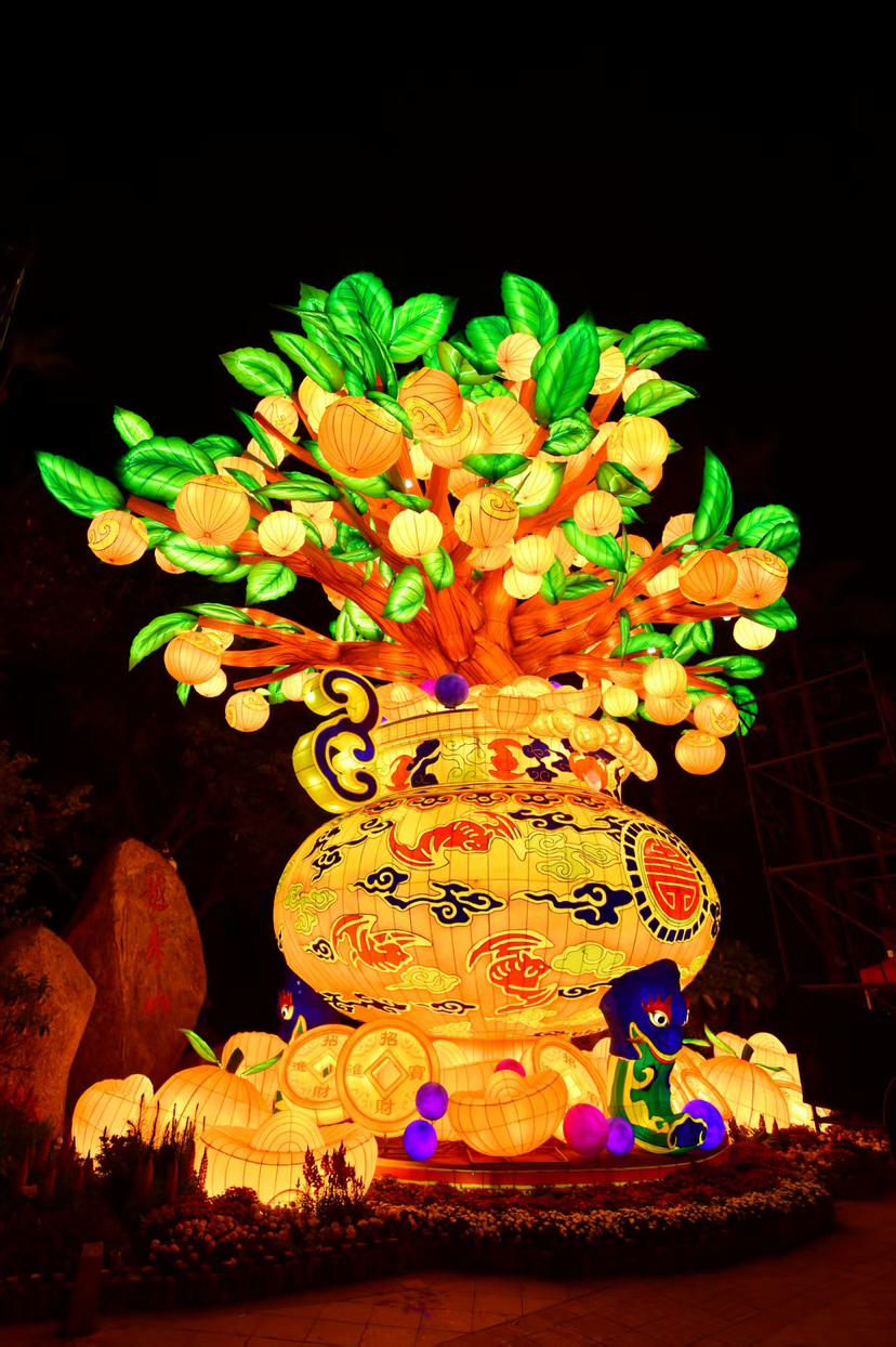 位于正门内广场的“大吉大利”灯组,高11米,以金光灿灿的年桔象征“吉祥圆满”,承载广府“行花街、买年花”的核心年俗情怀。其基座复刻清代乾隆年间“錾胎珐琅”金鼎,融合中西工艺精华,既彰显广州作为千年商埠的文化交融与创新基因,更以灯光为笔放大美好寓意,为观者送上新年吉祥顺意的真挚祝福。