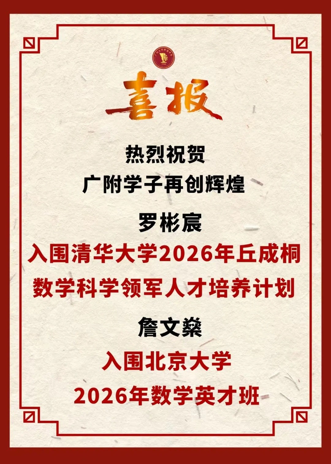 1月27日,广州大学附属中学在其微信公众号发布消息,该校罗彬宸同学入围清华大学2026年丘成桐数学科学领军人才培养计划,詹文燊同学入围北京大学2026年数学英才班。