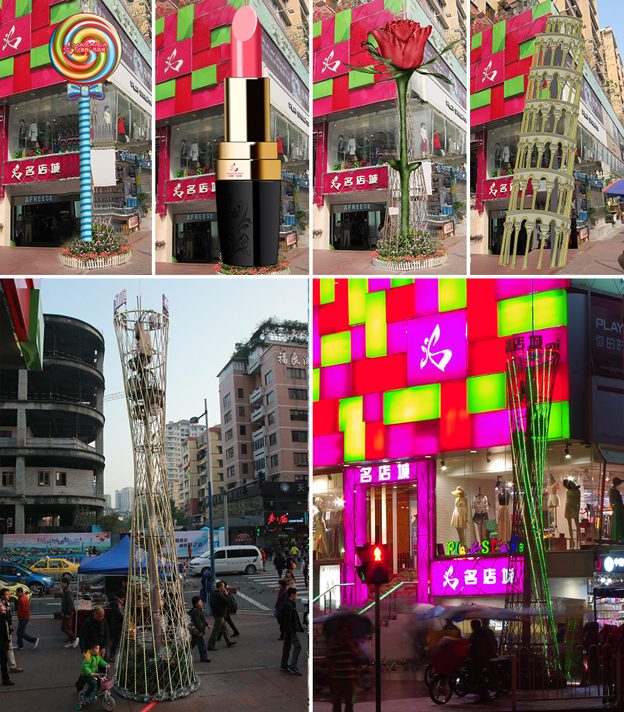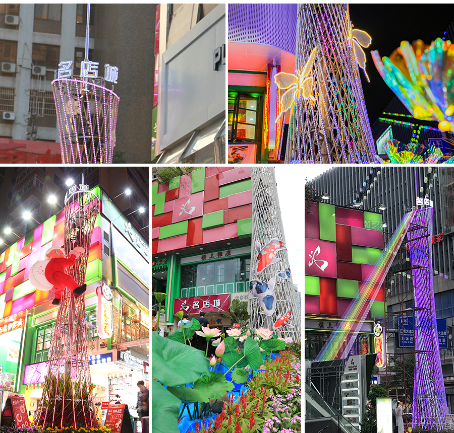 图:江南西·名店城旁迷你版“广州塔”此前曾尝试布置成树木、灯笼等造型,2012年最终参照广州塔设计成“小蛮腰”形态(源自江南西名店城商场微信公众号)