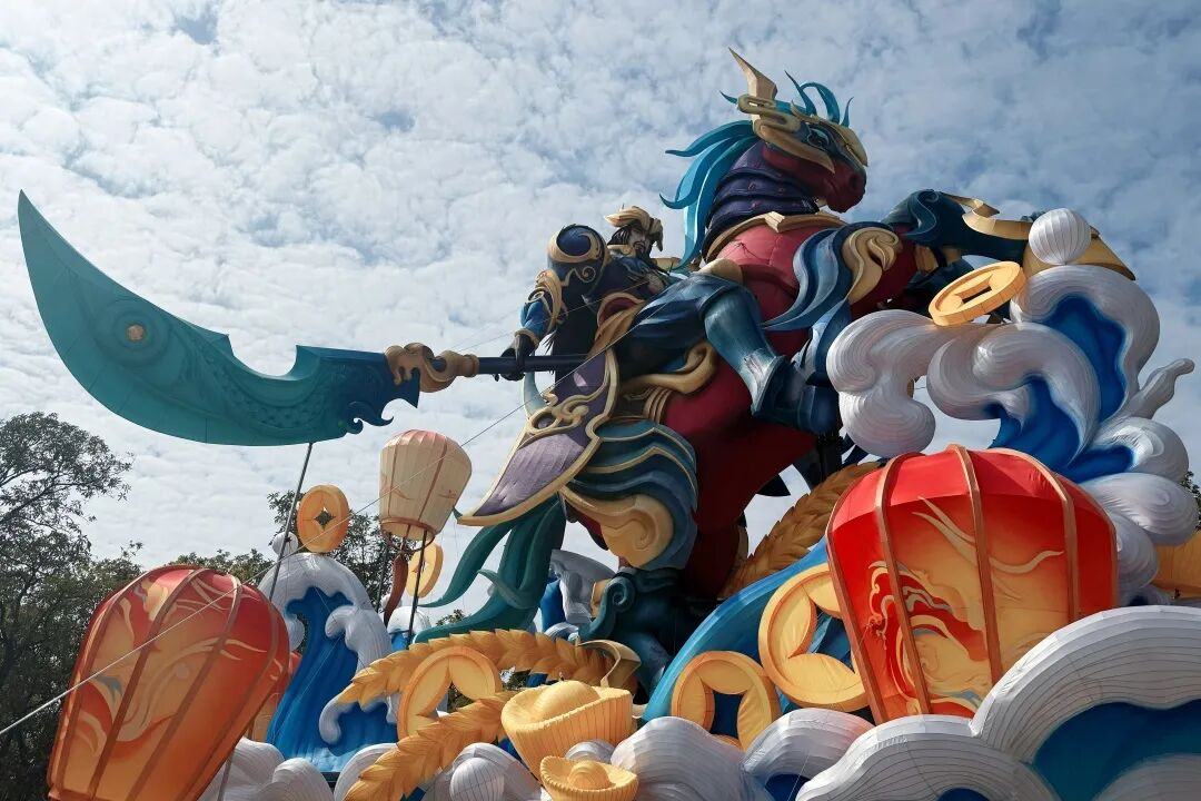 “绿野仙踪·生态和鸣”展区中,正在搭建的“南沙女神”灯组引人注目;而与《王者荣耀》联动的“关羽鲜衣怒马踏春来”灯组,则吸引了不少年轻游客的目光。