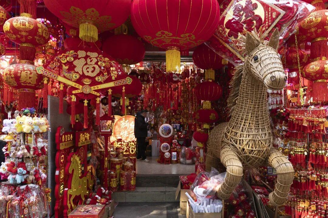 广州一德路“年货一条街”马年主题饰品已上新,喜庆用品店里摆满了马年生肖大型摆件、挂件、毛绒玩具和与马相关的春联、福字,年味扑面而来。(本组摄影 | 广州日报新花城记者陈忧子)