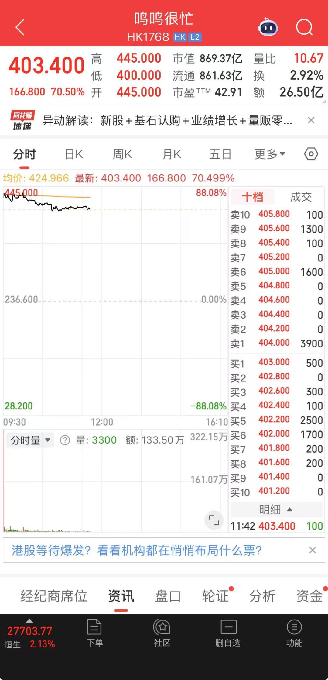 1月28日,中国最大的休闲食品饮料连锁零售商——湖南鸣鸣很忙商业连锁股份有限公司(以下简称“鸣鸣很忙”)正式在香港联合交易所主板挂牌上市,证券简称为“鸣鸣很忙”,股份代号为1768.HK。鸣鸣很忙开盘大涨88.08%,报445港元/股,随后股价有所回落,截至11时42分,报403.40港元/股,涨70.50%,最新市值达869.37亿港元。