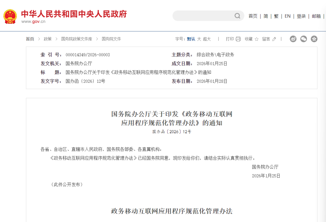 近日,国务院办公厅印发《政务移动互联网应用程序规范化管理办法》的通知。通知提到,主办(使用)单位应规范政务应用程序建设、使用管理,不得出现下列情况: