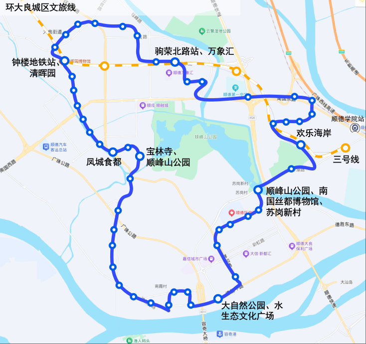 其中,环大良城区文旅线(T05)串联华侨城欢乐海岸、万象汇、清晖园、凤城食都、宝林寺、大自然公园、顺峰山公园等旅游景点,每天运营,班次密度10分钟/趟,可一站式领略大良的山色、水韵、文脉、美食,是大良环城微旅行首选线路。