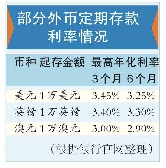 外币存款的利差优势也受到关注。相比人民币存款,美元存款利率虽然也在下行,但目前,部分城商行及大型银行的一年期美元定存利率仍在2.5%至3.6%区间。部分非美元外币存款的年化利率也可以达到“3字头”。