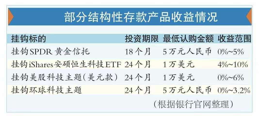 如有银行推出挂钩SPDR黄金信托的一款结构性存款,24个月投资期限的收益率范围为4%—10%,风险评级为3级,最低认购金额1万美元,到期100%本金保障。