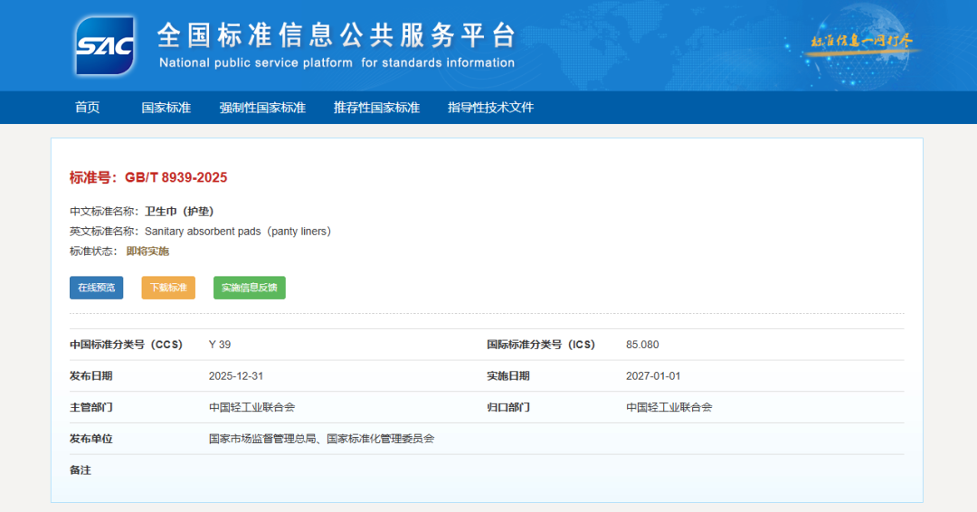 日前,全国标准信息公共服务平台网站上已可下载查阅标准号为GB/T 8939-2025的《卫生巾(护垫)》国家标准内容全文。据了解,新版国家标准将于2027年1月1日起开始实施。
