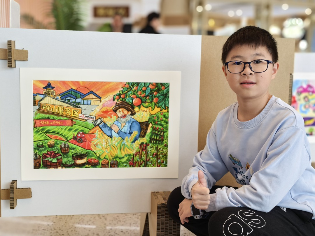 粤运交通粤东分公司经理龙奇峰的儿子龙泽安,假期陪爸爸在服务区值班,于是创作了作品《高速乐园:梁金山服务区梦》,荣获最佳主题表达奖。他说:“这是我去年在梁金山服务区看到的画面,老爷爷笑容满面地向人们售卖新鲜农产品,画面特别温暖幸福。”