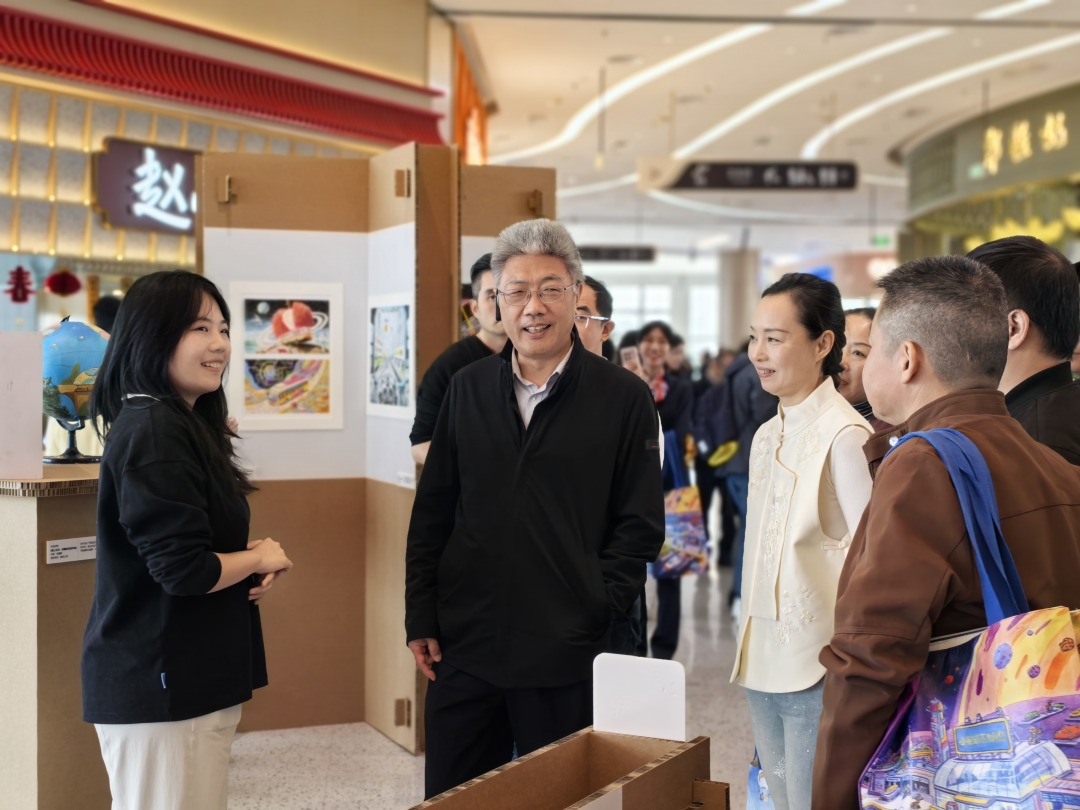 江罗高速职工张雪颖(左一)向观众介绍自己的创作思路。