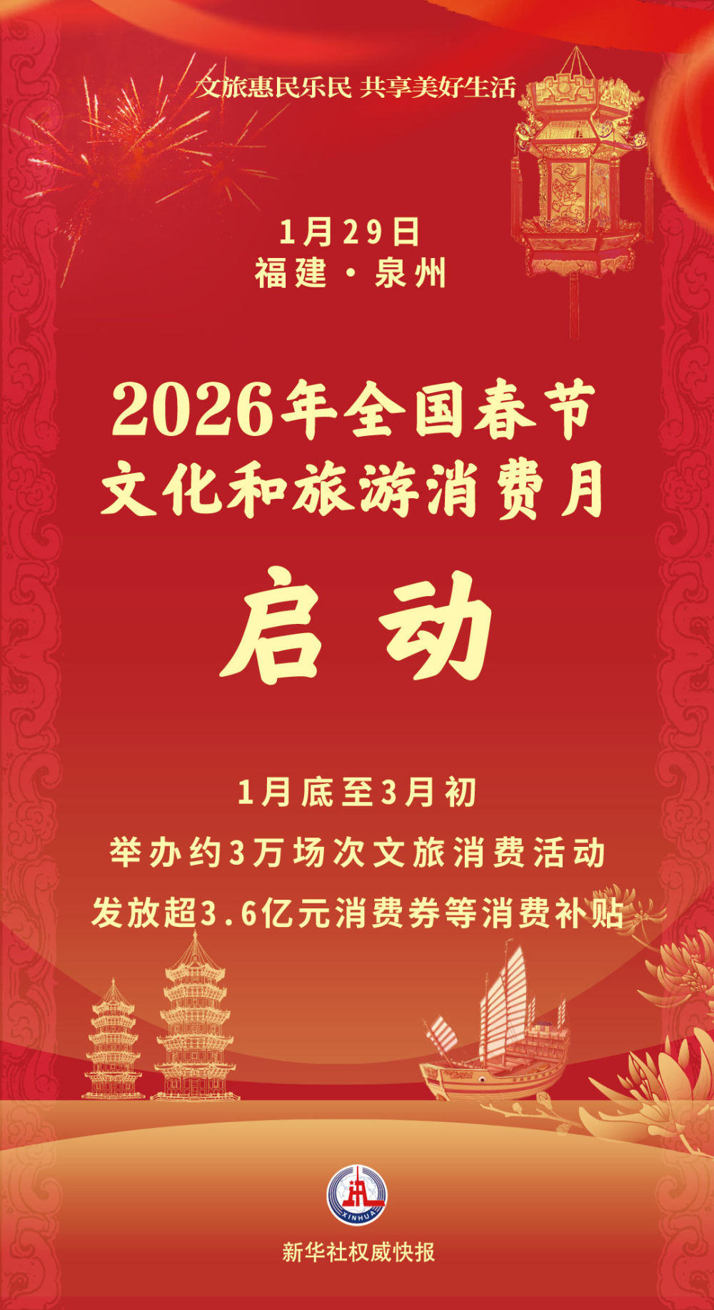 1月29日,文化和旅游部在福建省泉州市正式启动2026年全国春节文化和旅游消费月,组织各地围绕春节假期开展文旅消费惠民活动,更好满足人民群众“欢欢喜喜过大年”美好生活需要。